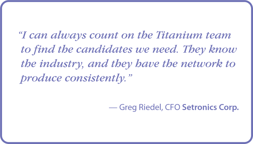 Our industry-specialized Recruiters and help staff are trained to uphold Titanium’s core principle, that people and the relationships we build are key to the long-term success of any business. Our clients and candidates continue to utilize our services because we foster relationships built on trust and empathy, which amplifies our ability to identify and provide for each of their individual needs.